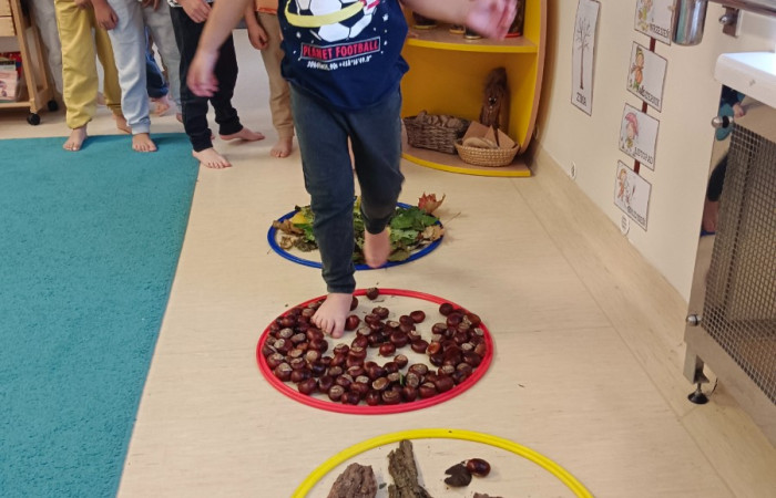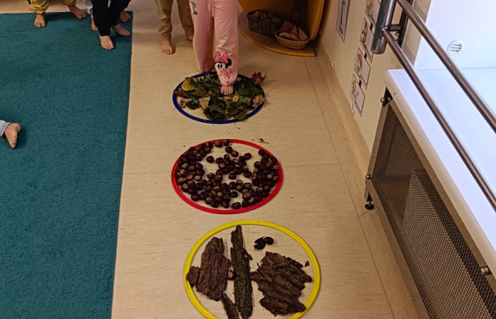 Nasze przedszkolaki bardzo lubią jesień. Dlatego w grupie „JEŻYKI” zrobiliśmy jesienną ścieżkę sensoryczną. Wykorzystaliśmy: szyszki, kasztany, liście i korę. :)