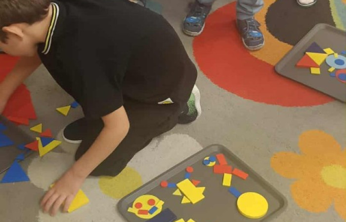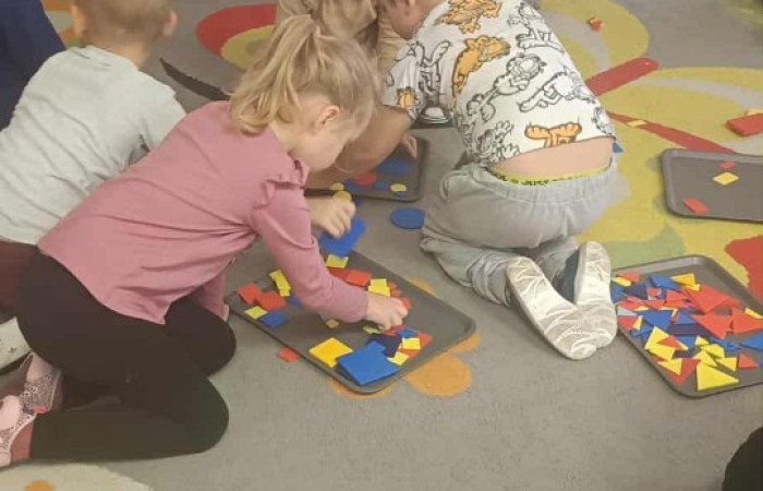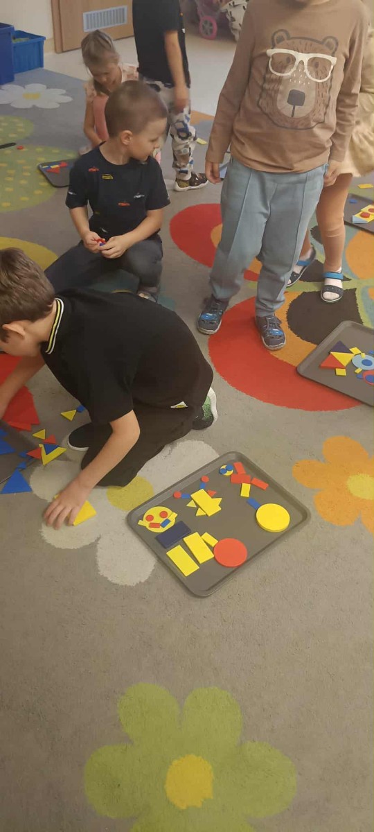 Zabawa z figurami rozwijała spostrzegawczość, logiczne myślenie oraz współpracę z rówieśnikami.