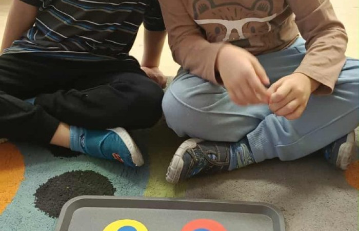 Podczas zajęć matematycznych przedszkolaki poznawały świat figur geometrycznych. Dzieci rozpoznawały i nazywały koła, trójkąty, kwadraty i prostokąty, a następnie segregowały je według kształtu i koloru. W parach układały z figur własne obrazki – domki, kwiatki, zwierzątka i pojazdy.