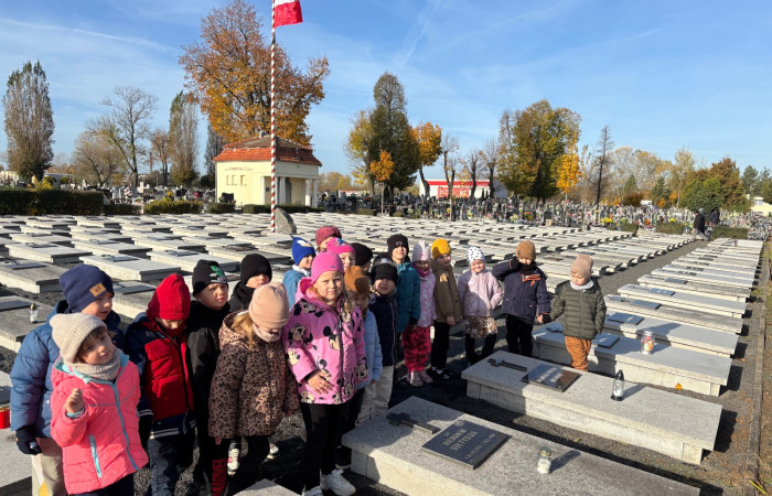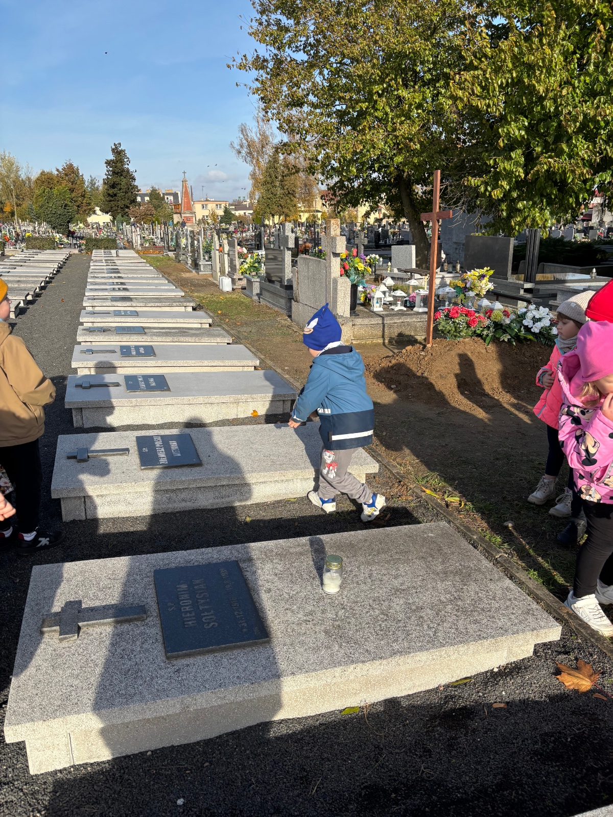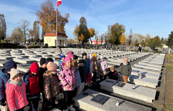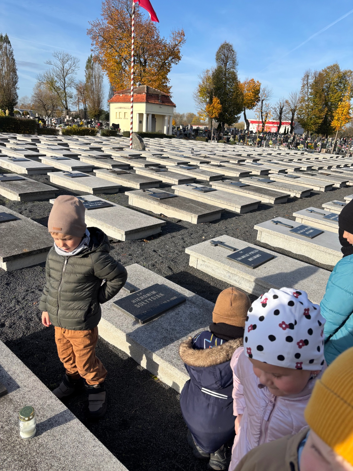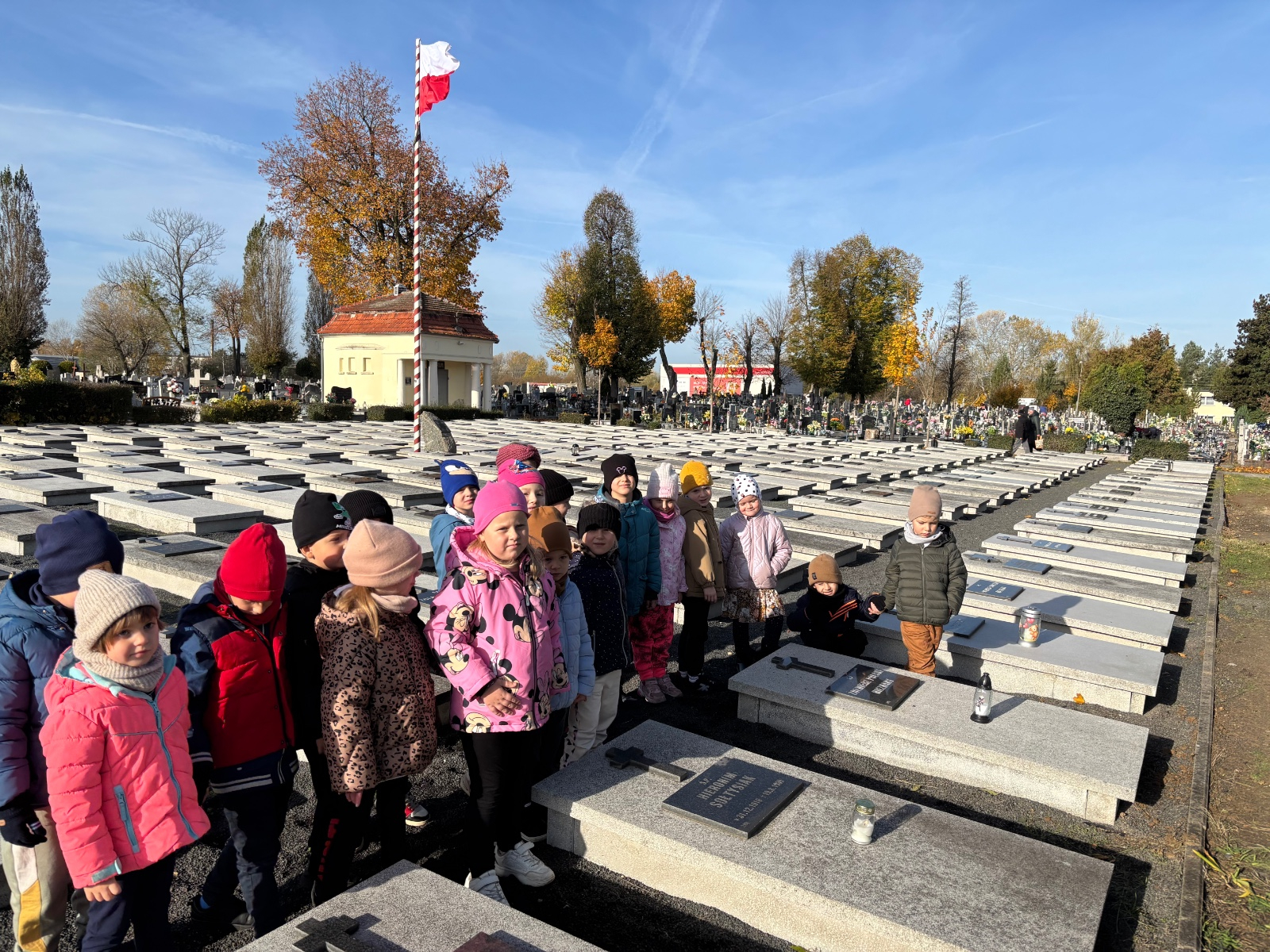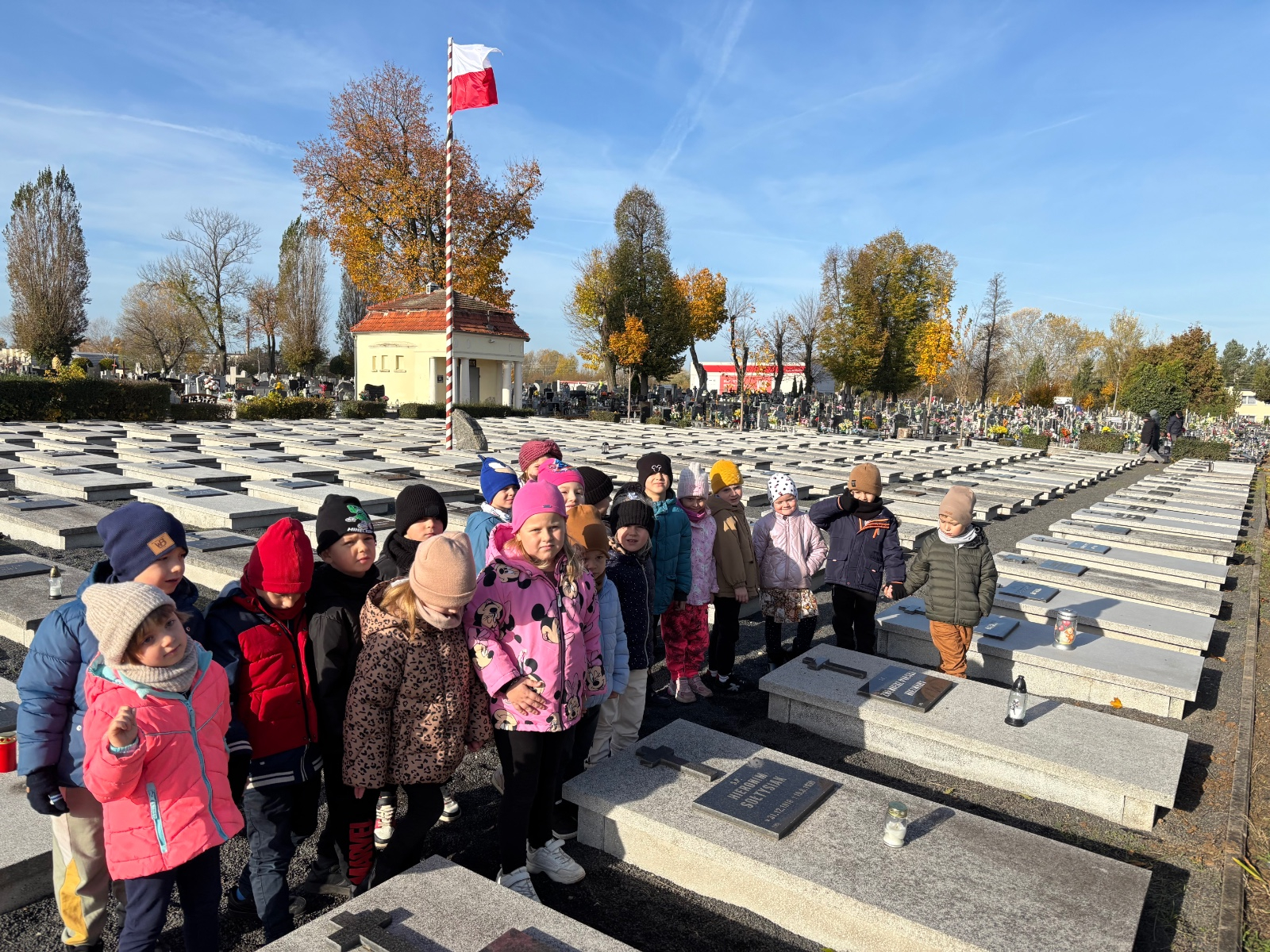 29 października dzieci z grupy „Jeżyki” korzystając z pięknej jesiennej pogody wybrały się na pobliski cmentarz przy ul. Witkowskiej, aby uczcić pamięć żołnierzy poległych za naszą Ojczyznę po I wojnie światowej. Jest to ważna lekcja wychowawcza, podczas której dzieci uczą się o pamięci, szacunku dla zmarłych i tradycji związanej ze Świętem Zmarłych.