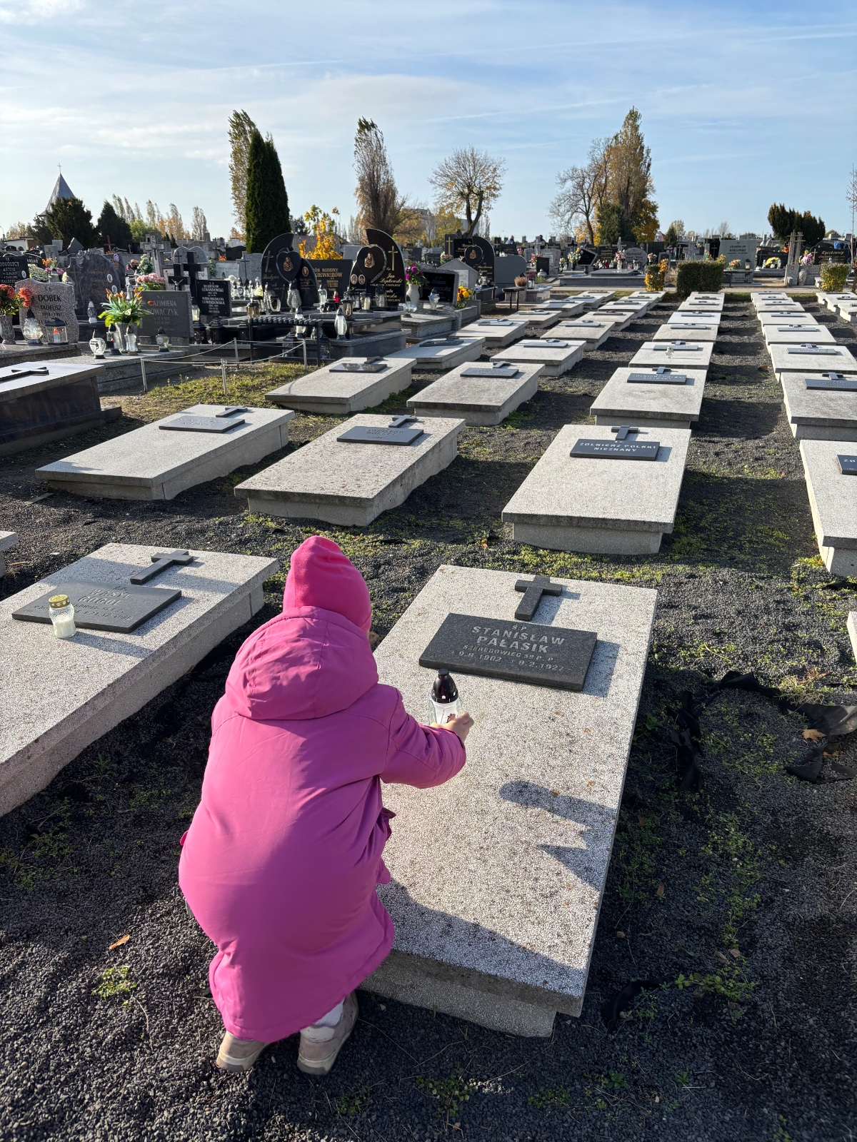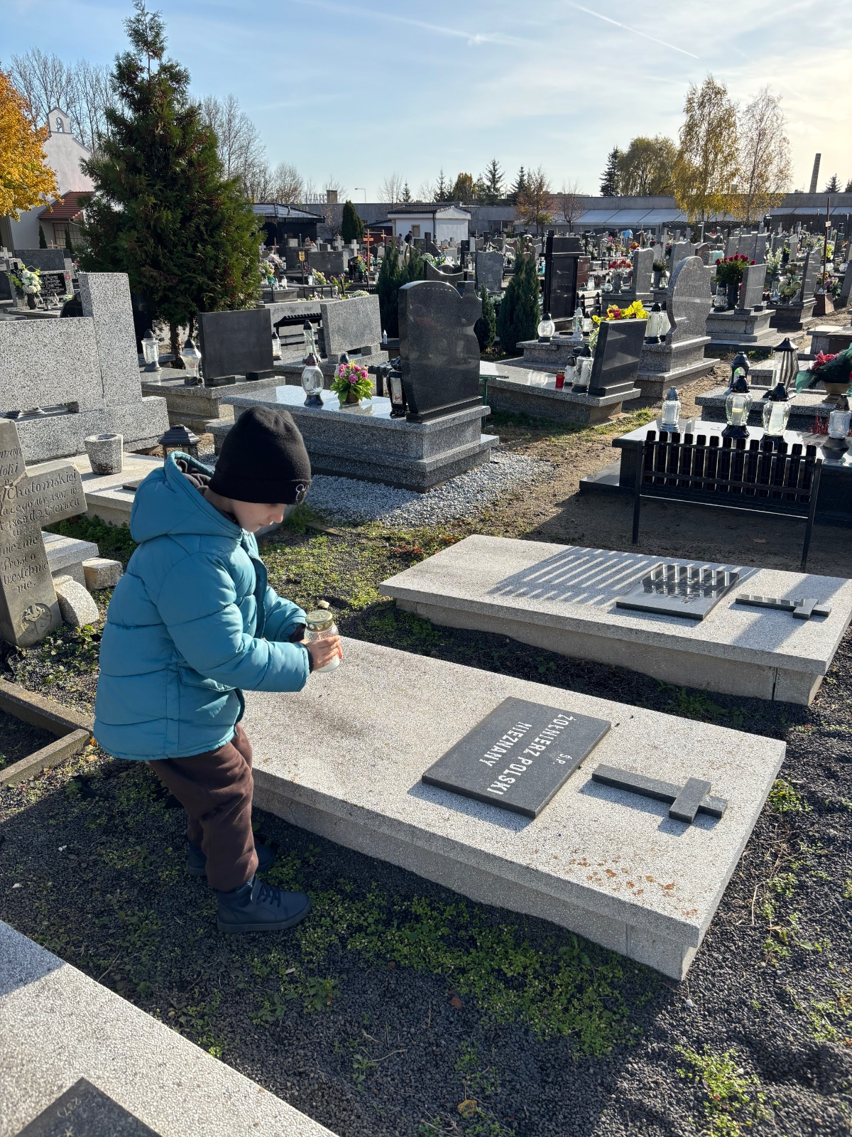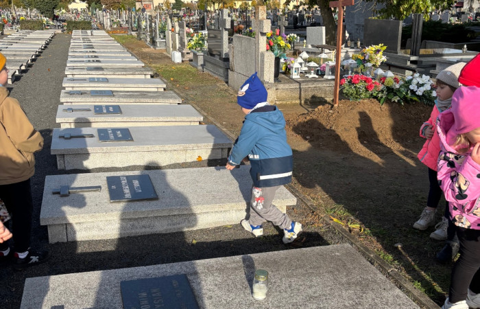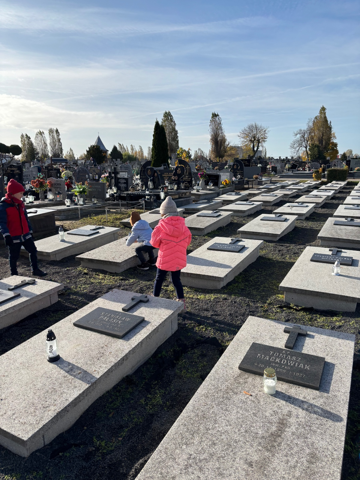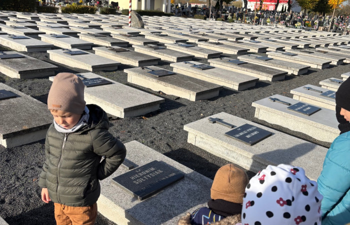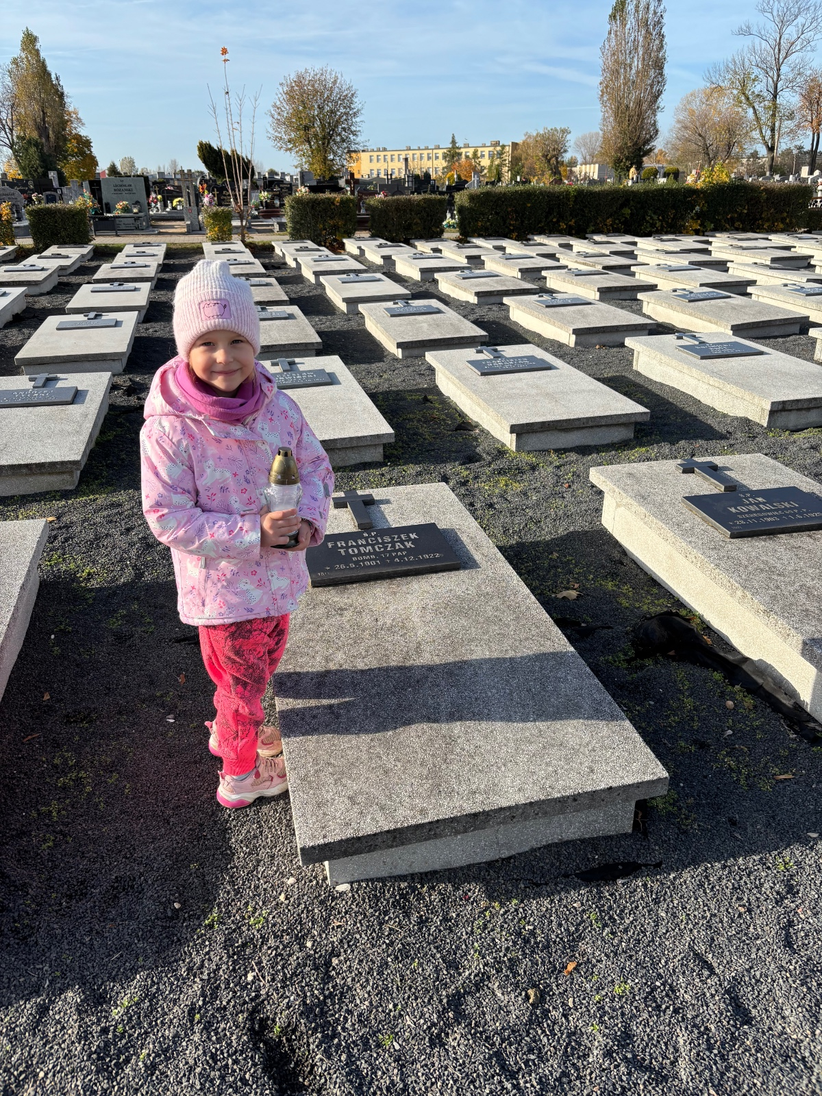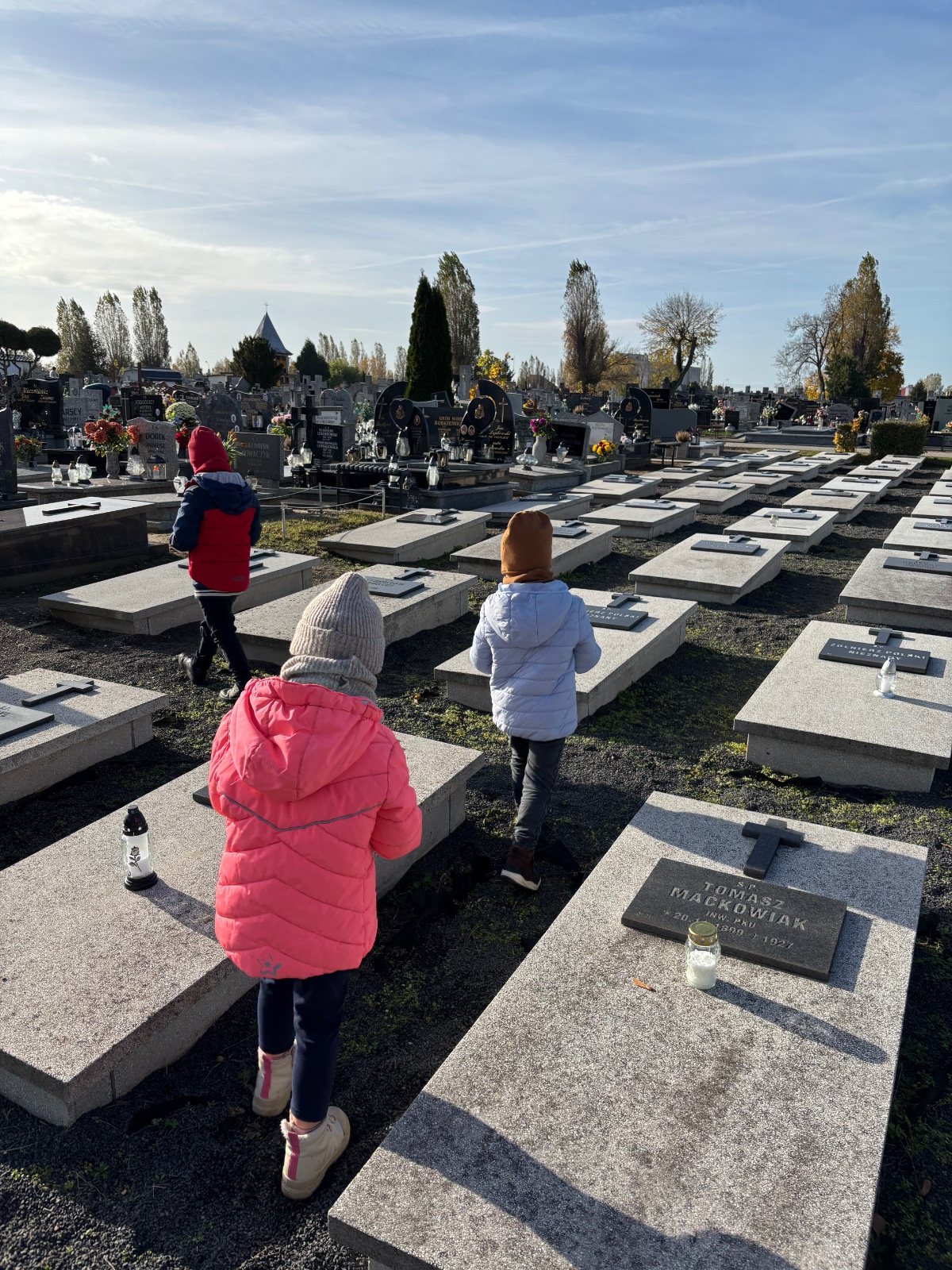 29 października dzieci z grupy „Jeżyki” korzystając z pięknej jesiennej pogody wybrały się na pobliski cmentarz przy ul. Witkowskiej, aby uczcić pamięć żołnierzy poległych za naszą Ojczyznę po I wojnie światowej. Jest to ważna lekcja wychowawcza, podczas której dzieci uczą się o pamięci, szacunku dla zmarłych i tradycji związanej ze Świętem Zmarłych.