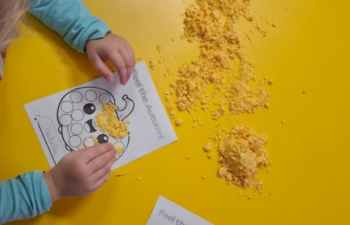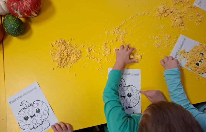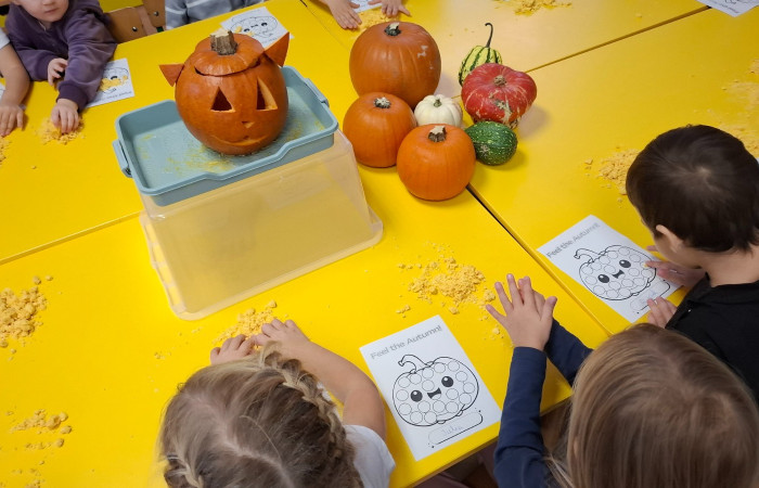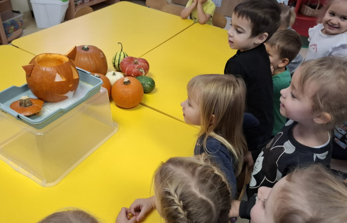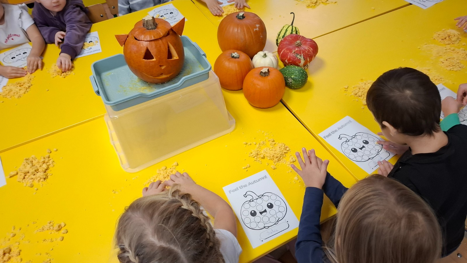 W ramach projektu edukacyjnego „Play with English – Play in English”, 29 października dzieci z grupy Żabek odkrywały tajemnice dyni! Przedszkolaki eksperymentowały z masą sensoryczną – dynioliną, poznawały jej właściwości, uczyły się, jak nazywa się dynia po angielsku, utrwalały kolory, a także porównywały wielkości dyni.