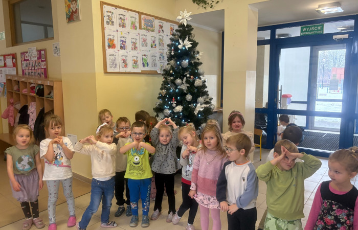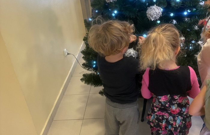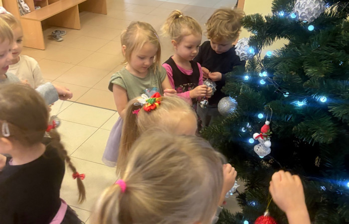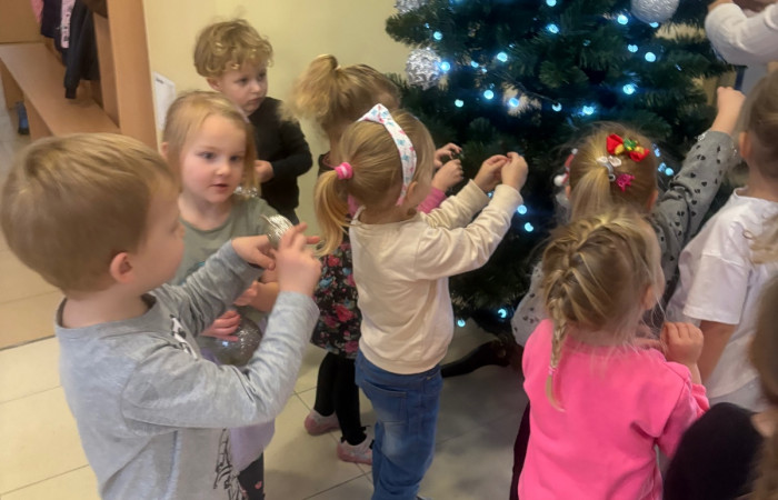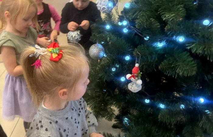 Przystrajanie choinki, która świeci dla wszystkich przekraczających próg przedszkola sprawiło nam bardzo dużo radości.. Efekt finalny sprawił, że byliśmy z siebie bardzo dumni.