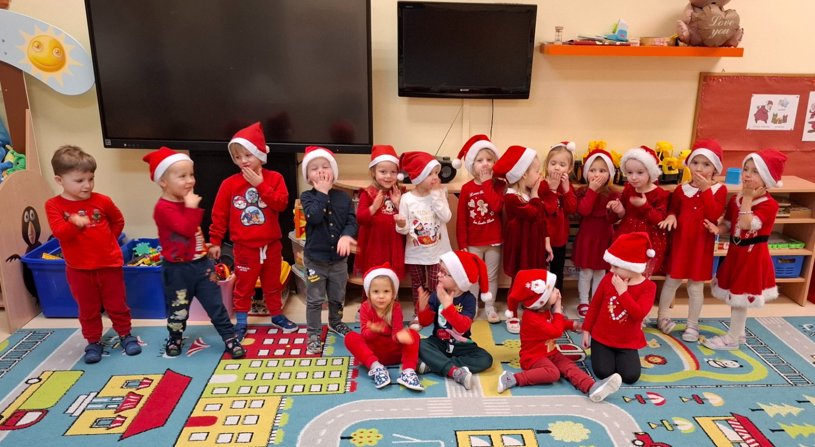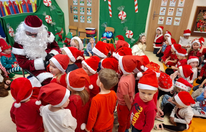 5 grudnia w naszym przedszkolu obchodziliśmy Mikołajki – dzień pełen radości, uśmiechu i wyjątkowych atrakcji. Świętowanie rozpoczęliśmy od obejrzenia przedstawienia przygotowanego przez dzieci z grupy Jeżyki, które wprowadziło wszystkich w świąteczny nastrój. Następnie na przedszkolnym placu czekała na dzieci niezwykła niespodzianka – spotkanie z uroczymi kucykami, które dostarczyło wielu niezapomnianych wrażeń. Zwieńczeniem tego wyjątkowego dnia było wręczenie prezentów przez Świętego Mikołaja, co sprawiło dzieciom ogromną radość.