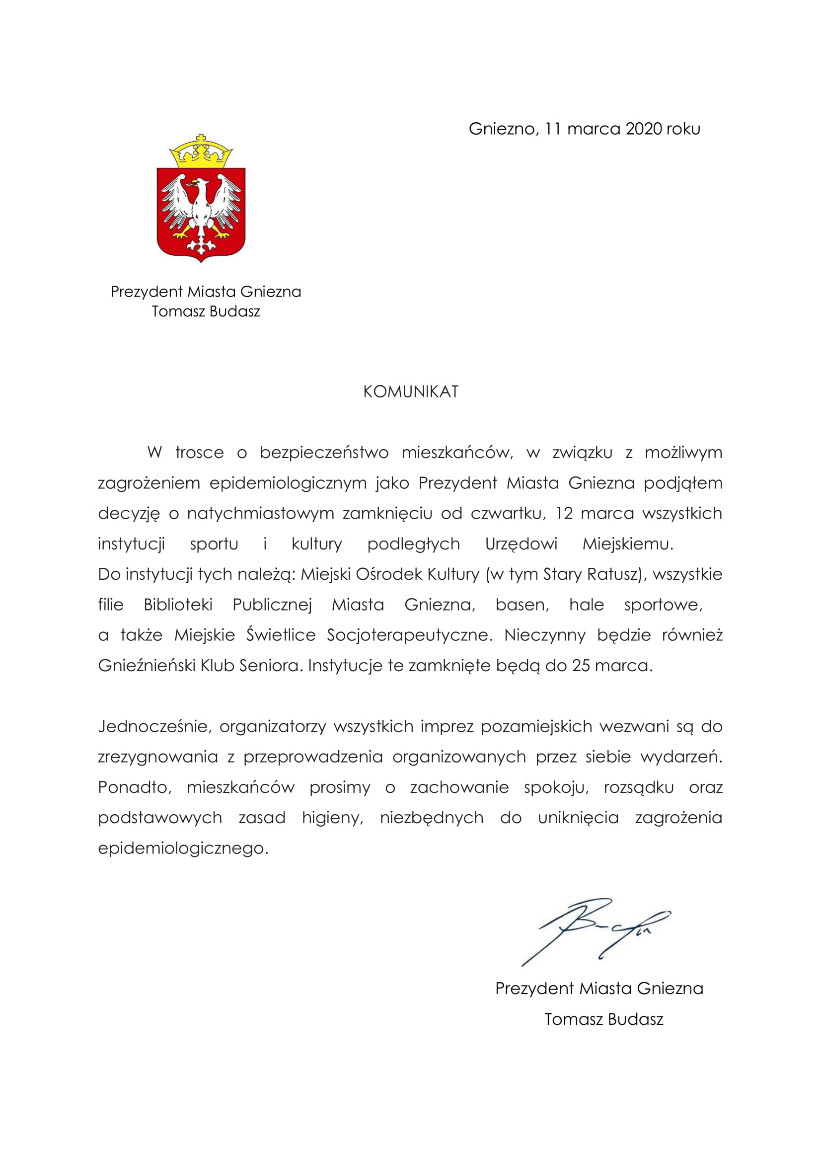 W związku z decyzją MEN z dnia 11.03.2020r. informuję, że