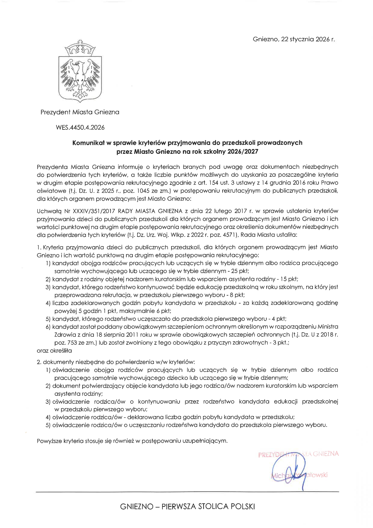 Nie złożenie deklaracji o kontynuowaniu wychowania przedszkolnego w wyznaczonym terminie jest jednoznaczne z rezygnacją miejsca w przedszkolu w roku szkolnym 2026/2027